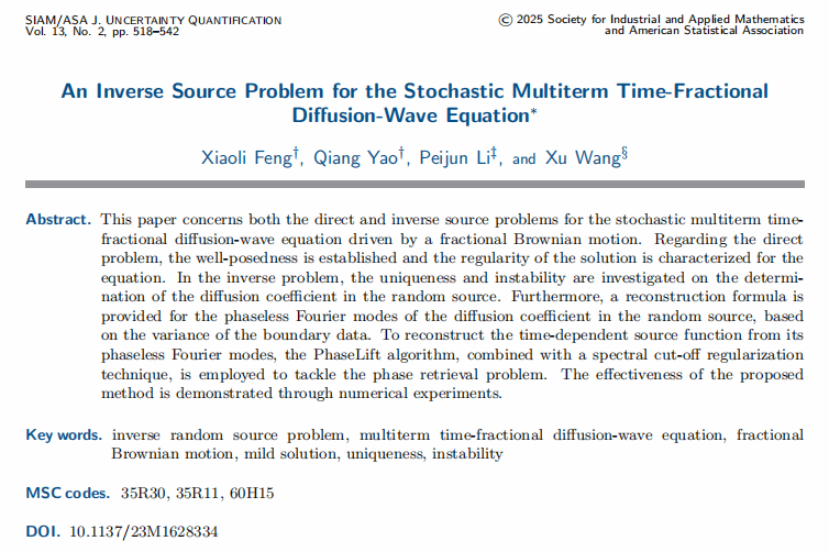 近期,2026年世界杯官网冯晓莉副教授,研究生姚强和中国科公司数学与系统科学研究院李培军研究员,王旭副研究员合作,在随机微分方程反随机源的理论分析和数值计算方面取得新进展,相关结果发表在美国工业与应用数学学会旗下重要期刊SIAM/ASA Journal on Uncertainty Quantification上 [Xiaoli Feng, Qiang Yao, Peijun Li, Xu Wang, An inverse source problem for the stochastic multi-term time-fractional diffusion-wave equation, SIAM/ASA Journal on Uncertainty Quantification, 13(2), 518-542, 2025]。