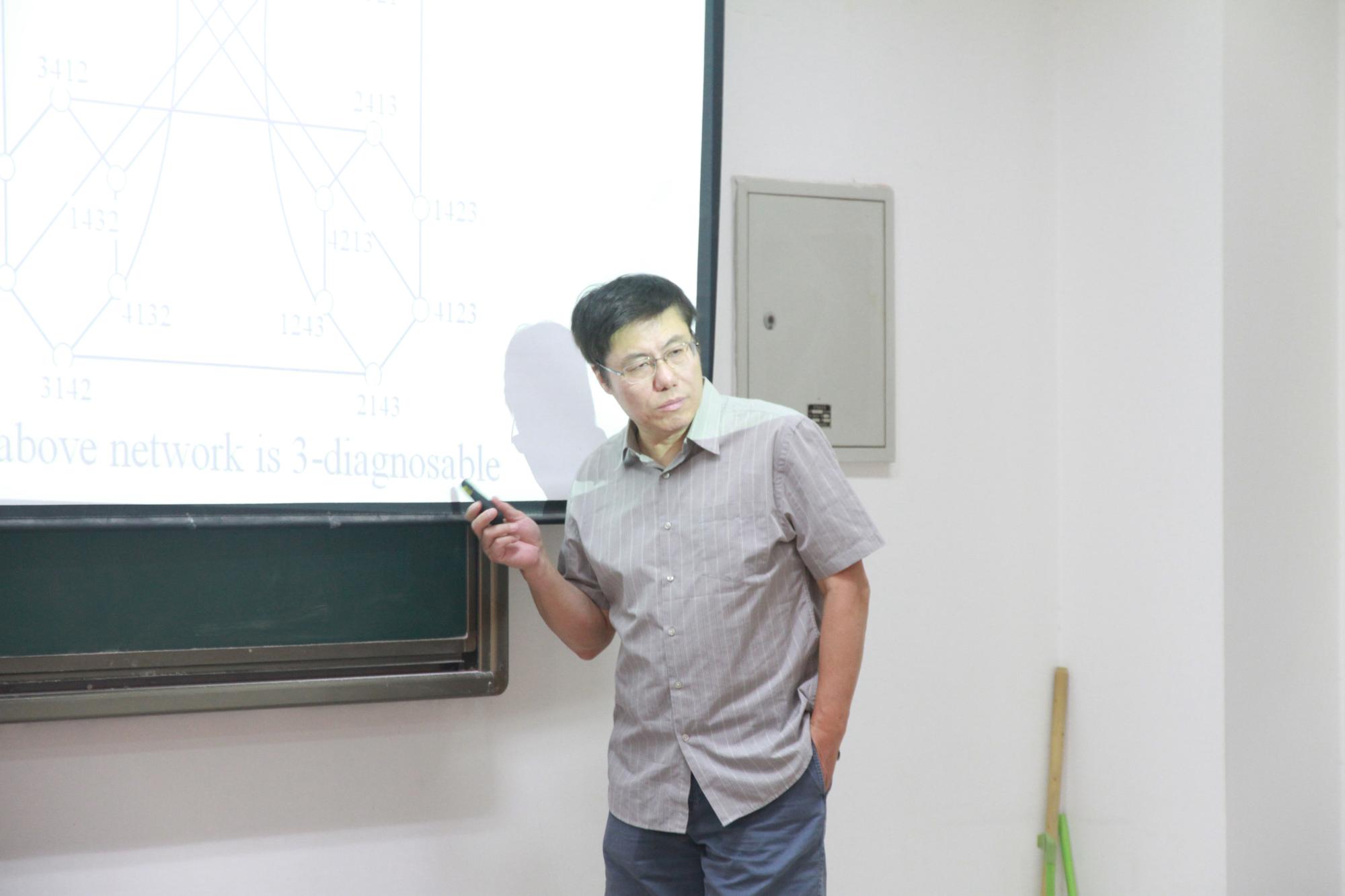 王教授首先为大家介绍了蒙特克莱尔州立大学的校史、位置和环境等基本情况。报告正式开始,王教授从故障诊断背景引入,随着科技的发展,多处理器系统中包含处理器数目越来越多。即便每个处理器的可靠度能达到99.99%,在拥有上万台处理器的系统中,发生故障的概率也是不容忽视的。然后,王教授以PMC模型为例简洁易懂的介绍了系统及诊断、t-可诊断度及不可诊断等概念。为了让大家更好的理解可诊断和不可诊断的概念,王教授分别罗列出了3圈中有且仅有一个或两个故障节点时所有可能出现诊断结果,发现当仅有一个故障节点时,系统共有3种故障情形和12种诊断结果,每种诊断结果均是唯一出现的,因此经过一次测试后,根据出现的测试结果可以确定所故障的节点,因此3圈系统是1-可诊断的。当系统中有两个故障节点时,共有3种故障情形和48种诊断结果,每两个故障情形所对应诊断结果中都有重复。因此3圈系统不是2-可诊断的。随后,给出了t-可诊断与顶点数、连通度相关的充分条件。最后,在超立方体等网络中展示了Structure Connectivity和Substructure Connectivity这一新提出的概念及其相关的性质和理论。最后王老师介绍了推广的t连通度的研究历史及现在的一些进展。