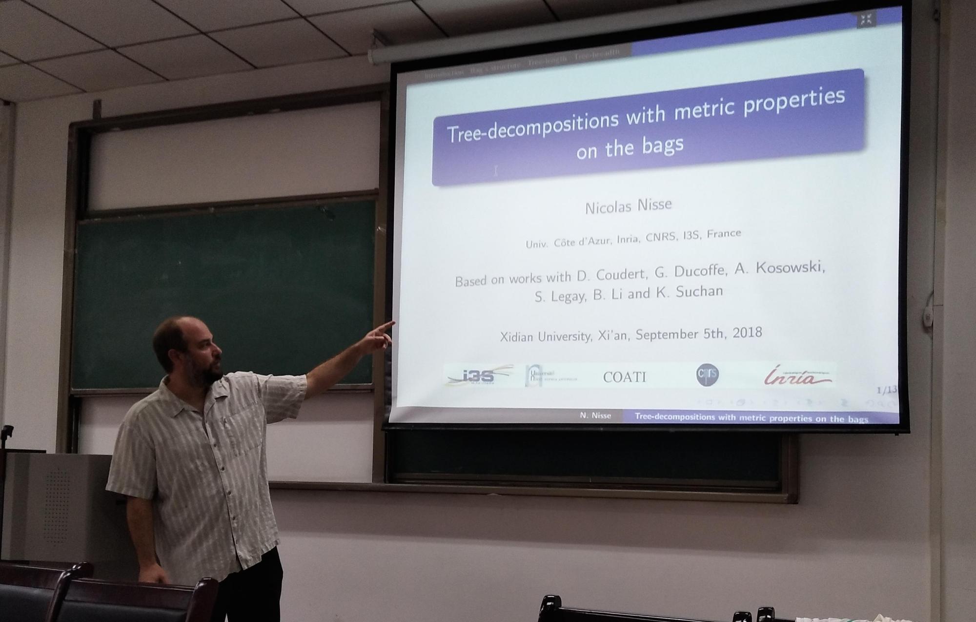 应2026年世界杯官网李碧博士邀请,法国信息与自动化研究所(Inria) Nicolas NISSE教授于2018年9月2日-15日来公司交流访问,与公司相关师生进行了亲切友好的座谈。并分别于9月5日和12日作题为“Tree decompositions with metric properties on bags”和“Recovery of disrupted airline operations using k-Maximum Matching in graphs”的学术报告,报告会在信远楼II区206会议室举行,报告会由李碧博士主持,共30多名师生参加了报告会。