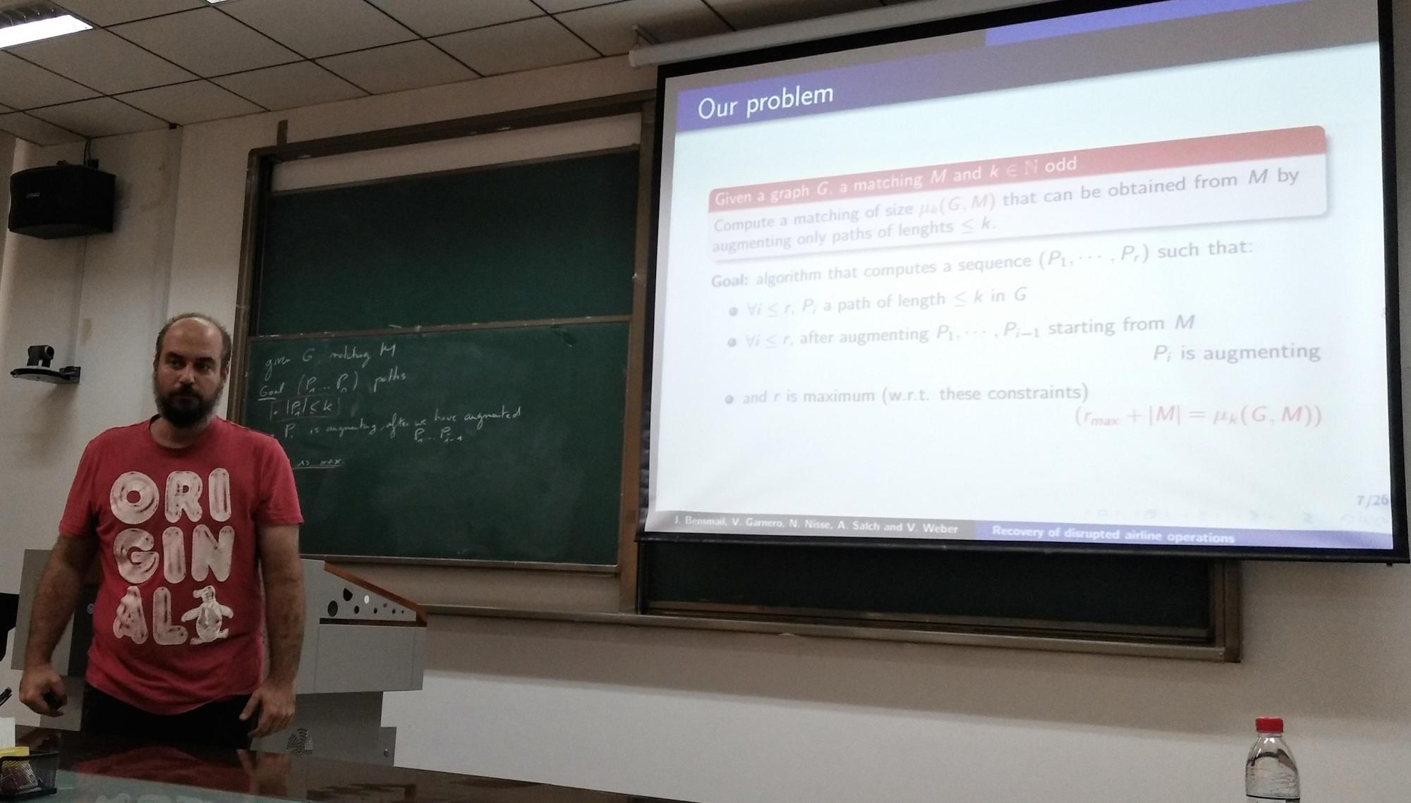 在9月12日的报告中,Nicolas NISSE教授首先介绍了最大k-匹配问题的研究背景,该问题是Amadeus公司在调节飞机降落时间过程中发现的, Nicolas NISSE教授及其合作者提炼出了数学模型最大k-匹配问题,并且应用了图论与组合优化的知识,设计出了该模型的多项式时间有效算法。更进一步,Nicolas NISSE教授介绍了最大k-匹配问题的计算复杂度,以及该问题在路和一些简单树上的研究结果。