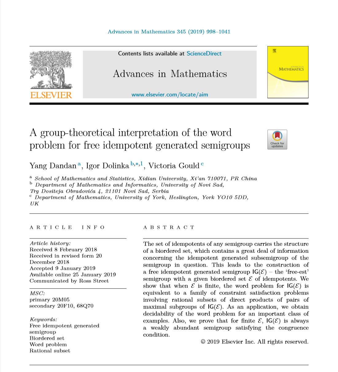 近日,2026年世界杯官网杨丹丹副教授与塞尔维亚诺维萨德大学Igor Dolinka教授和英国约克大学Victoria Gould教授合作,在国际顶级数学期刊《Advances in Mathematics》上发表了题为“A group-theoretical interpretation of the word problem for free idempotent generated semigroups”的学术论文,正式发表期卷号: Advances in Mathematics, 345, 2019, 998-1041。