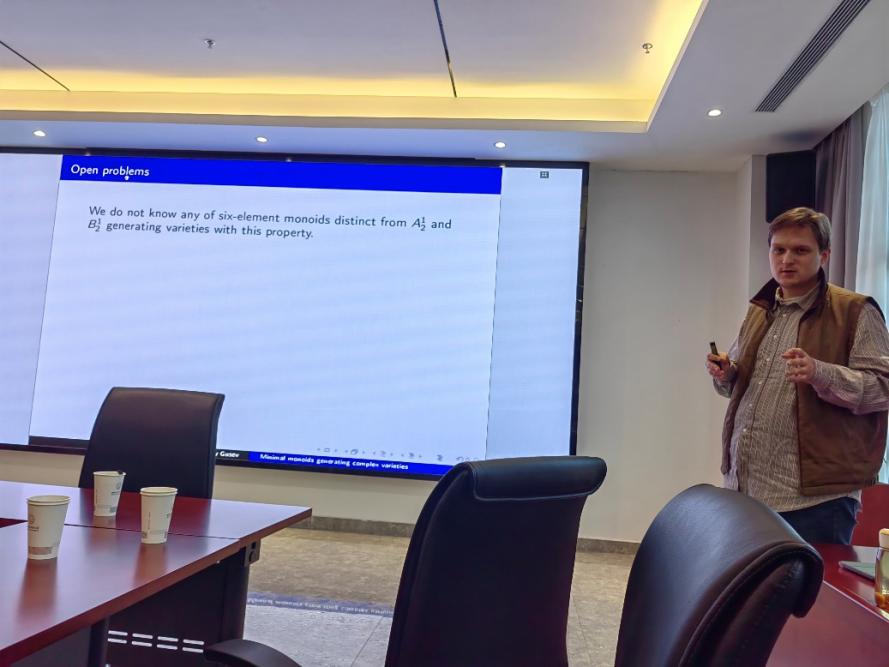 Mikhail Volkov教授的报告从图表半群(diagram monoid)的发展历史讲起,围绕此类半群的重要问题:等式检验问题,阐述了图表半群的研究现状和前沿进展。Sergey Gusev博士在报告中介绍了有限泛簇的概念,借助Brandt半群和Cross簇的结合等工具研究了半群的有限泛簇性。两位专家的报告深入浅出、图文并茂、逻辑与趣味性并存。基础数学专业的青年教师杨丹丹、李欢欢等与两位专家就报告内容展开讨论,并就后续的科研合作进行探讨。