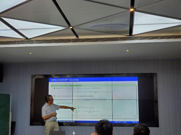 5月30日下午,AbdelLisser教授作了题为“Distributionally robust chance-constrained Markov decision processes”的学术报告。报告由青年教师彭深主持,应用数学与运筹学相关专业的青年教师和研究生等20余人参加了报告会。AbdelLisser教授由马氏决策入手,介绍了不同不确定集合下的分布式鲁棒机会约束马氏决策模型的转化、求解与应用。青年教师彭深,研究生李泽宇、介科伟等与专家就报告内容展开讨论,并就后续的科研合作进行探讨。报告结束后,多名员工与AbdelLisser教授合影留念。