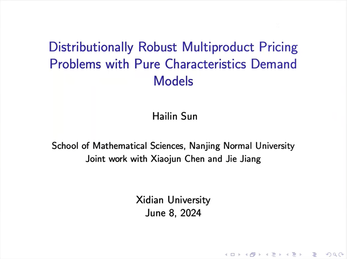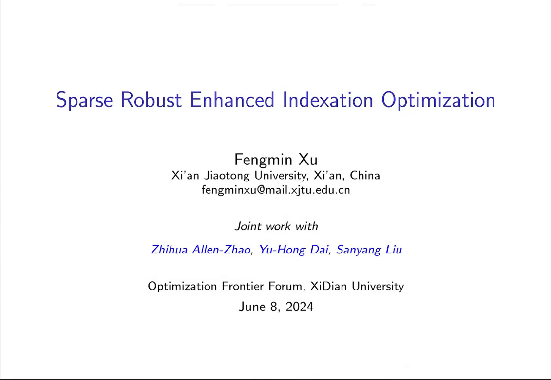 第四节,北京交通大学罗自炎教授、南京师范大学孙海琳教授、西安交通大学徐凤敏教授分别做了题为“A Globally Convergent Inexact Augmented Lagrangian Method for Zero-One Composite Optimization”、“Data-Driven Distributionally Robust Multiproduct Pricing Problems Under Pure Characteristics Demand Models”和“Sparse Robust Enhanced Indexation Optimization”的报告。