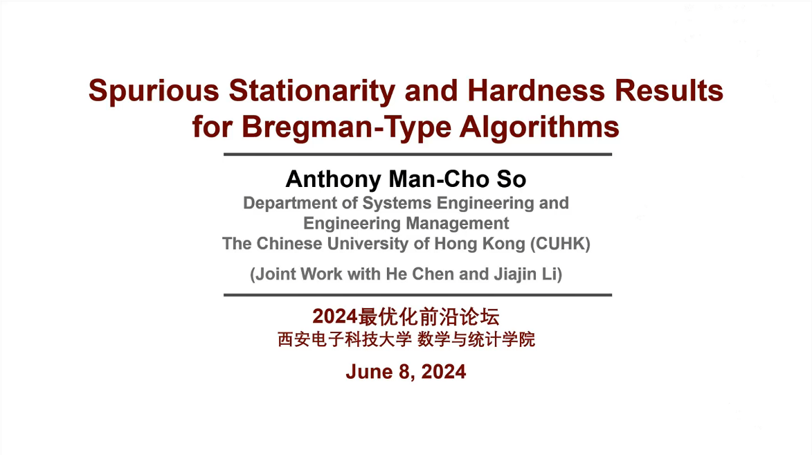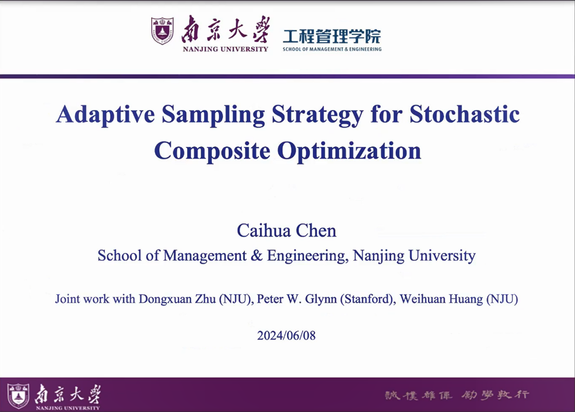 下午举行的第三节,香港中文大学苏文藻教授、南京大学陈彩华教授分别做了题为“Spurious Stationarity and Hardness Results for Bregman-Type Algorithms”和“Adaptive Sampling Strategies for Stochastic Composite Optimization”的报告。