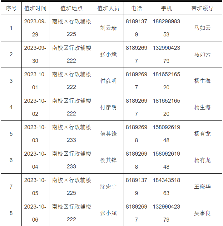 2023年中秋节和国庆节假期值班安排表