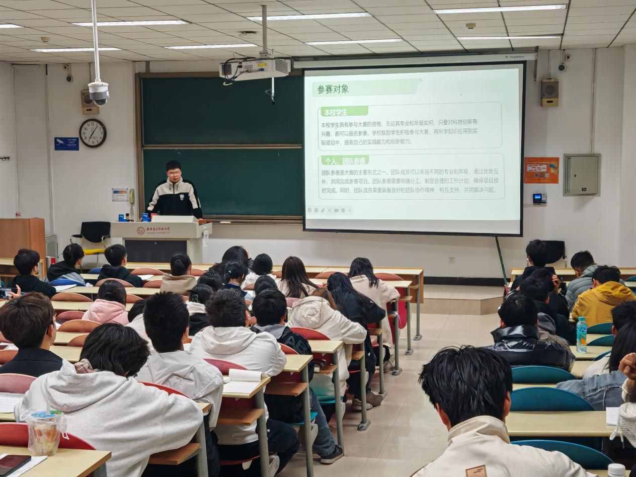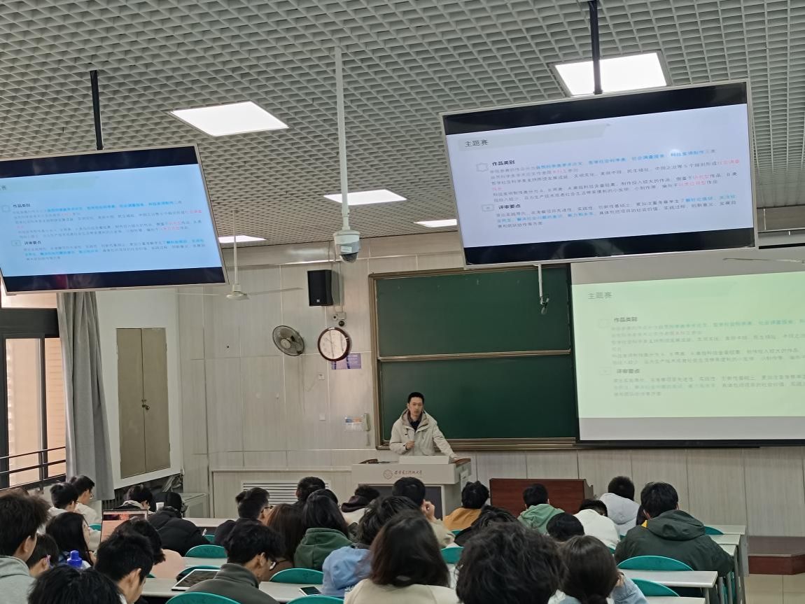 宣讲现场,赛程内容和安排的介绍让同学们对赛事有了清晰认知。互动答疑环节中,同学们就报名细节、作品规范、提交形式等多个方面进行了提问,宣讲人员及老师认真倾听每一个问题,耐心细致地进行解答,还精心分享了过往的优秀作品案例,从创意构思、技术实现到展示形式,全方位为同学们提供创作思路,现场交流氛围浓厚。
