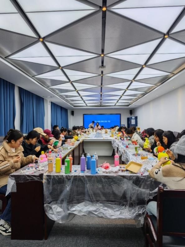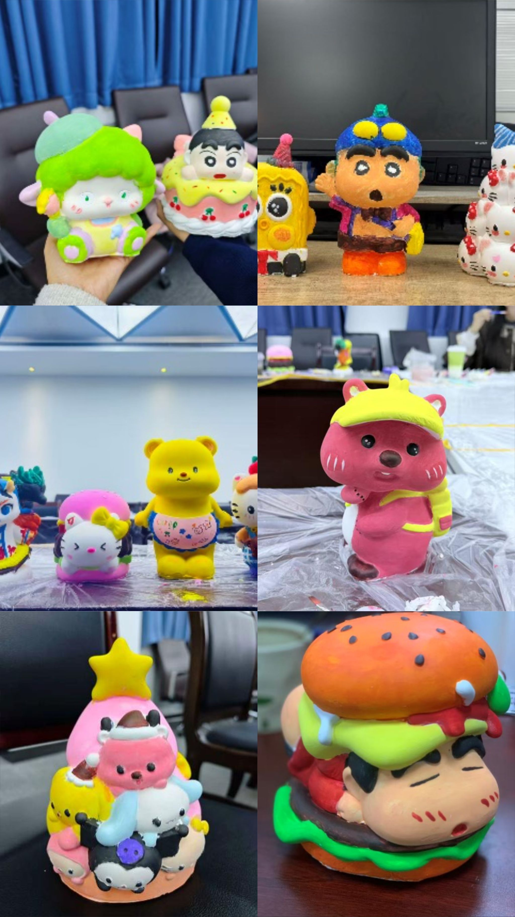 石膏娃娃涂鸦区洋溢着活泼生动的创作氛围。同学们挑选心仪的卡通造型,调色绘彩、细心涂抹,为素白石膏注入个性与生机。李婷婷一边绘制手中的娃娃,一边笑着说:“好像回到了小时候,专注涂色的过程特别解压。”大家互相交流配色心得、分享创作巧思,在笑语盈盈中完成了一件件独一无二的作品。短短两小时,一个个色彩斑斓、风格各异的石膏娃娃陆续诞生,成为同学们手中可触摸的童心纪念。