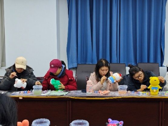 在手工创作的悠然时光里,同学们以指为笔,以心为墨,沉浸于创作的乐趣中。这份专注不仅让紧绷的神经悄然放松,更在无形中舒缓了日常学业带来的压力。而在手工制作的间隙,同学们围坐一起,轻声细语地分享着彼此的故事与心得。这份轻松愉快的交流,如同温暖的阳光,悄然拉近了心与心的距离。“平日里,我们总是埋头于实验室的忙碌,难得有这样闲适的时刻,能边做着手工,边畅所欲言。”许雅婷同学的话语中充满了感慨,她的话语也道出了大家的心声。