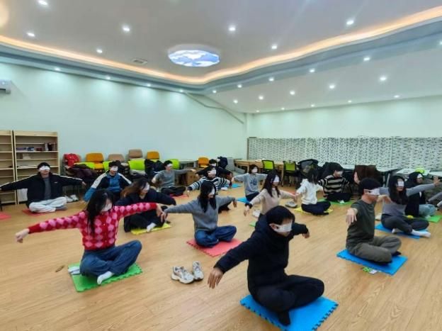 伴随舒缓的音乐,老师带领大家进行呼吸调整与渐进式身体放松练习。借助引导语,同学们逐渐将意识从外部转向自身,细致感知呼吸的节奏与身体的细微变化。参与同学分享道:“当闭上双眼、专注呼吸时,外界的纷扰仿佛悄然远去,我终于能够清晰听见自己内心的声音。”这种身体与心灵的双重打开,让参与员工真正体会到了与自我对话的奇妙感受。