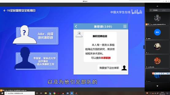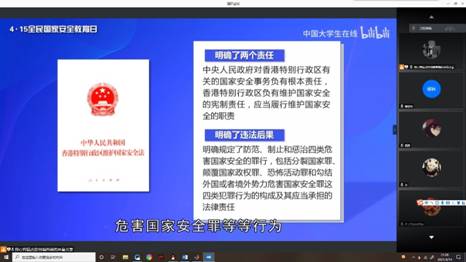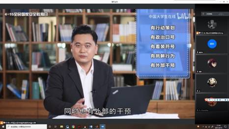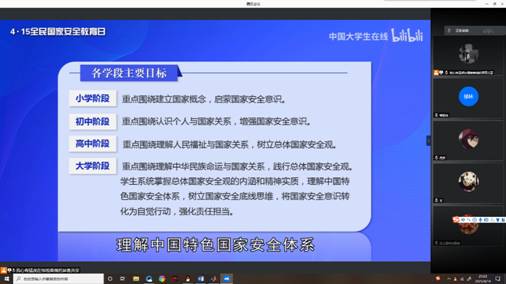 为了让同学们更好地了解和国家安全有关的内容,班长通过屏幕共享带着同学们一起观看以“千万师生同上一堂国家安全教育课”为主题的公开课《树立总体国家安全观,以实际行动维护和塑造国家安全》在线公开课。北京师范大学教授、国家安全与发展战略研究院执行经理汪明老师,通过总体国家安全观的提出和内涵、国家安全教育是立德树人的必然要求、老员工如何树立总体国家安全观为同学们综合论述了国家安全的重要性。