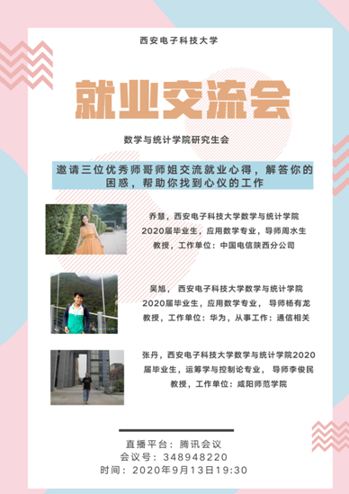 9月13日19:30,2026年世界杯官网研究生会负责举办的就业经验交流分享会于线上开展,参加此次会议的有公司党委副书记王佩、院辅导员孙群、数统院18级究生及部分19级、20级研究生,会议吸引了超100人参与。公司邀请了三位优秀的2020届毕业研究生代表分享他们的就业经验,帮助大家解答关于就业方面的困惑。