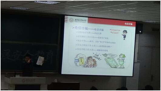 魏巍从校内行骗、电信诈骗、交通安全以及秋冬季防范四个方面,结合近年来发生的校园内的真实案例,给同学们上了一节生动的安全教育课。在谈到校内行骗时,魏巍从宿舍推销英语报纸、电话卡和劣质中性笔等有物推销诈骗,到冒充香港大学交流生和孤寡老人等无物诈骗进行了详细解读,警示同学们切勿贪图一时便宜而上当受骗。