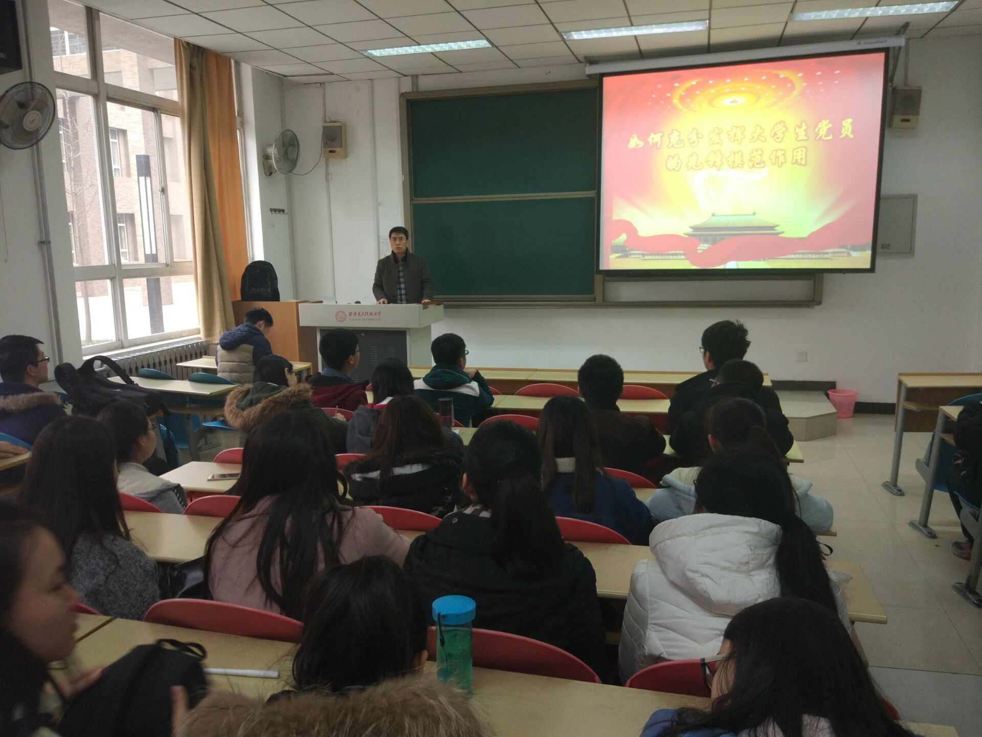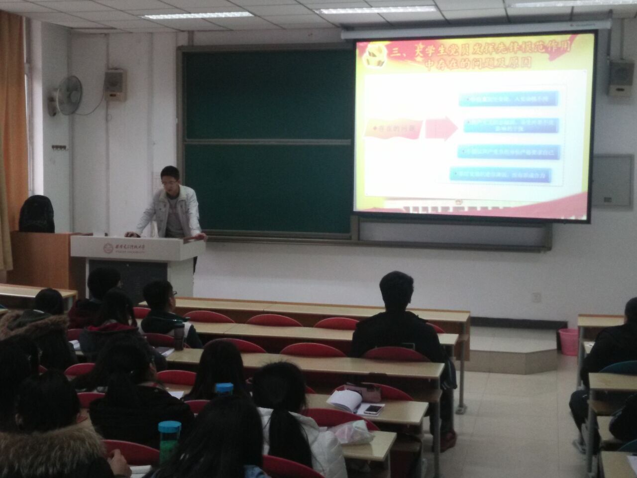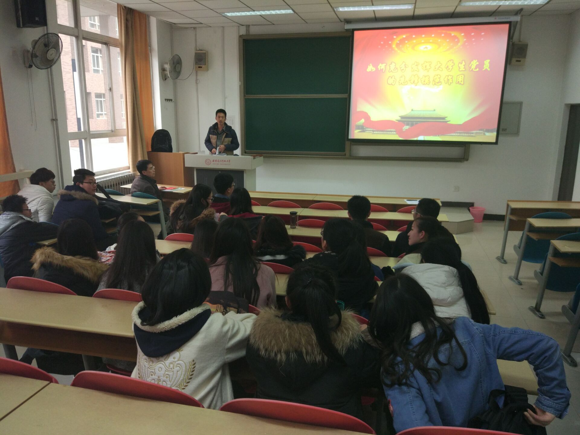 首先,房亮老师给党员同学们讲党课,就十八届六中全会精神和重要意义做了简要介绍;对前期“两学一做”学习教育中的不足进行分析,对新党员的“两学一做”学习教育提出要求。同时讲到党员同学要从各方面严格要求自己,要进一步增强政治意识、大局意识、核心意识和看齐意识,要立足自己是一名新时代老员工的实际,发挥党员的先锋模范作用。然后,支部组织委员万彦然同学带领大家学习党章。最后,大家一起重温长征的革命历史,观看了纪念长征胜利80周年纪录片《铁流两万五千里》。