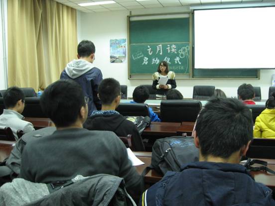启动仪式首先为参加活动的同学放映了励志影片《风雨哈佛路》,放映结束后,启动仪式正式开始。读书是同学们获取知识的重要途径,“书籍是人类进步的阶梯”、“书中自有黄金屋”等中外名言都强调了读书的重要性。学习部的同学结合幻灯片为同学们宣传读书月活动,同时向同学们介绍了泛读、精读、略读等十种阅读方式,并在人文、励志等几个类别中为同学们推荐了不少名家著作。学习部的组织人员根据同学们的个人意愿,将同学们分成四至六人的读书小组,相互交流读书心得,并建立了读书月活动的QQ群方便同学们探讨和分享阅读的收获。